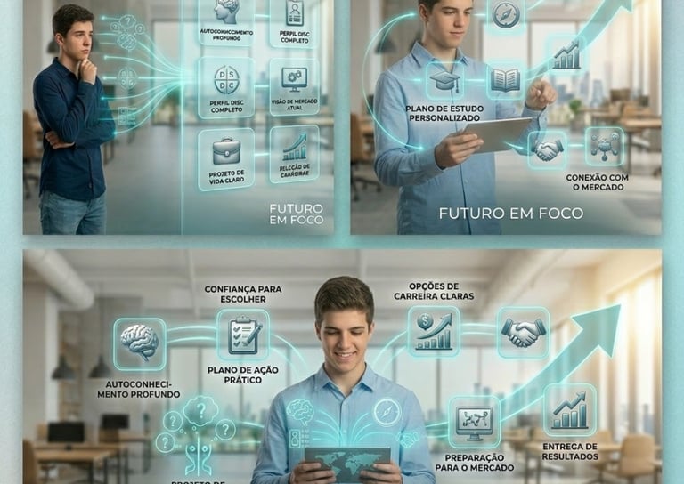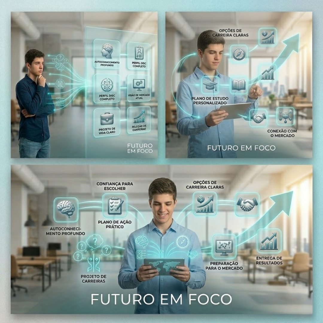 Para jovens que estão na fase de escolha profissional, estão no 3º ano do ensino médio e querem transformar incertezas em um plano de carreira com propósito, autoconhecimento, clareza sobre os seus talentos e interesses, visão de futuro e um passo a passo para escolher a profissão certa desde o início.