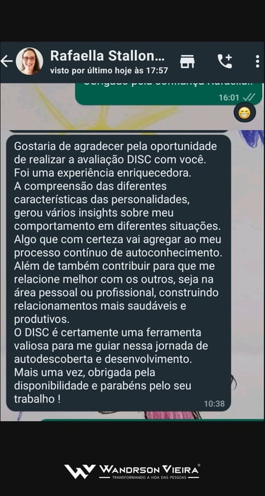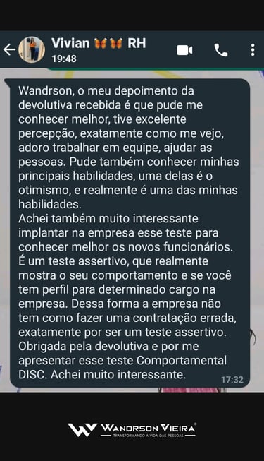 Eu te ajudo a construir uma transição de carreira estratégica, segura e assertiva, para que você saia da estagnação, conquiste clareza sobre seus talentos e diferenciais, e se reposicione no mercado ou inicie seu próprio negócio sem precisar começar do zero, com segurança, autoconfiança e um plano claro de ação.”